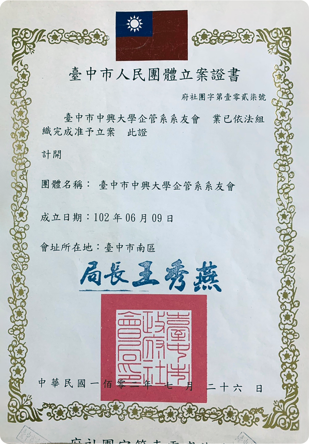 第一條:本會定名為「臺中市中興大學企管系系友會」(以下簡稱本會)。