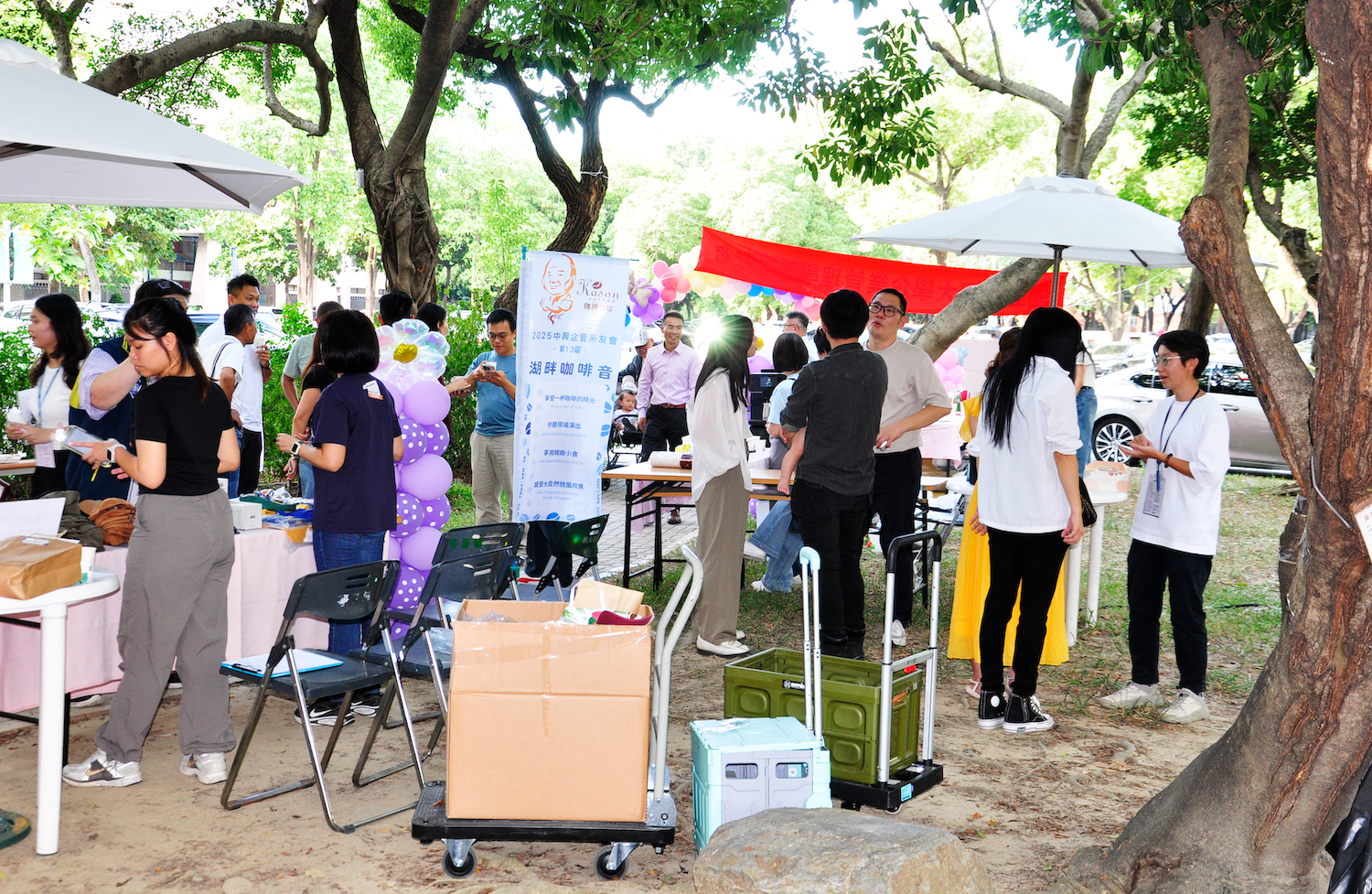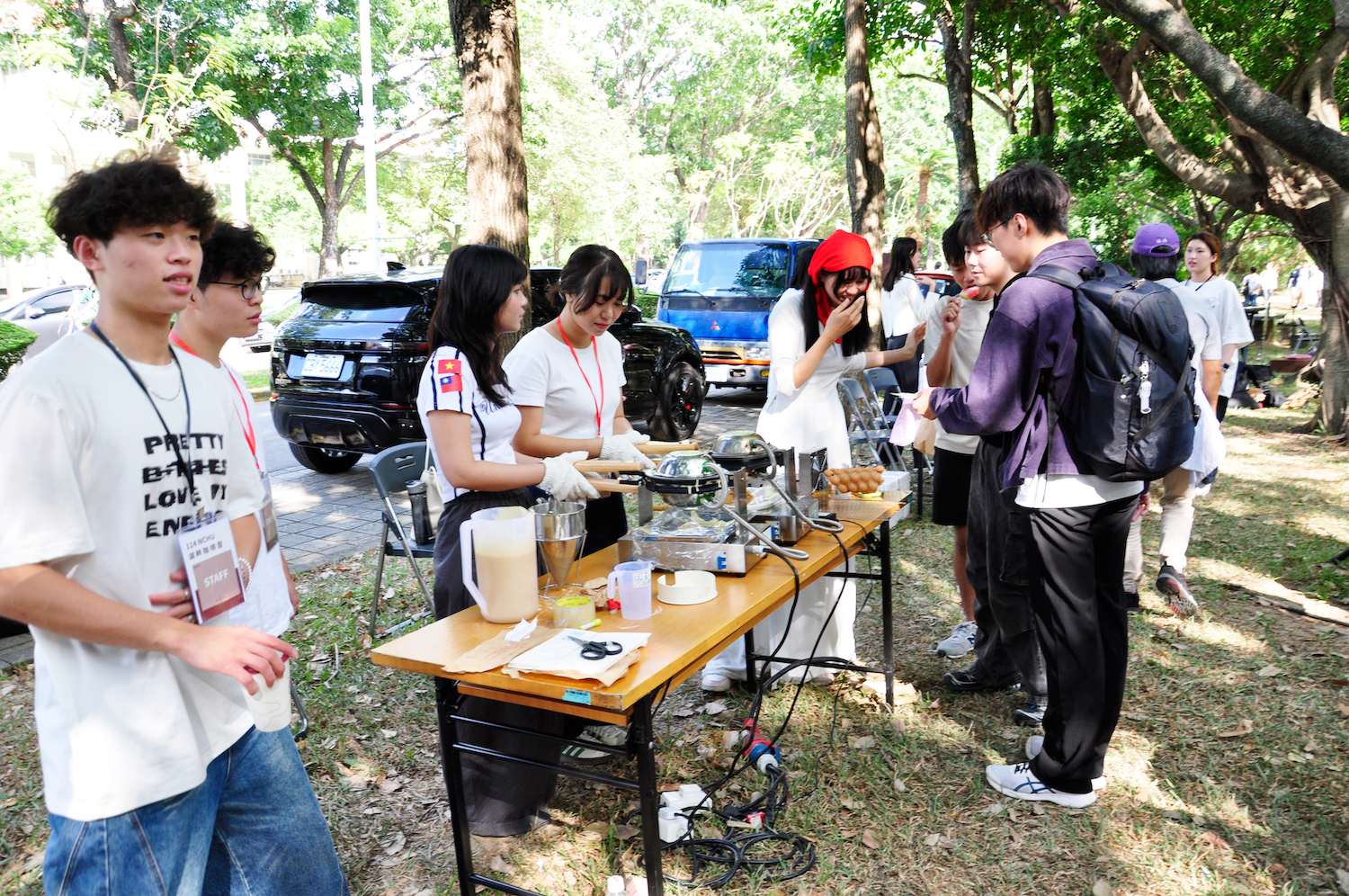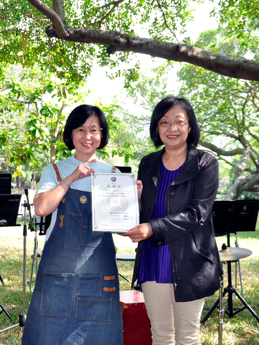 在秋天涼風徐徐的中興湖畔,聽著樂音、品嚐咖啡香氣、心情整個舒緩愉悅。會場有受歡迎甚至大排隊的雞蛋糕、手搖飲、冰棒,如果肚子餓就來一盒涼麵。活動中,返校參加的系友們,與師長聊聊,跟久未碰面的同學聚聚,交換彼此的心得。